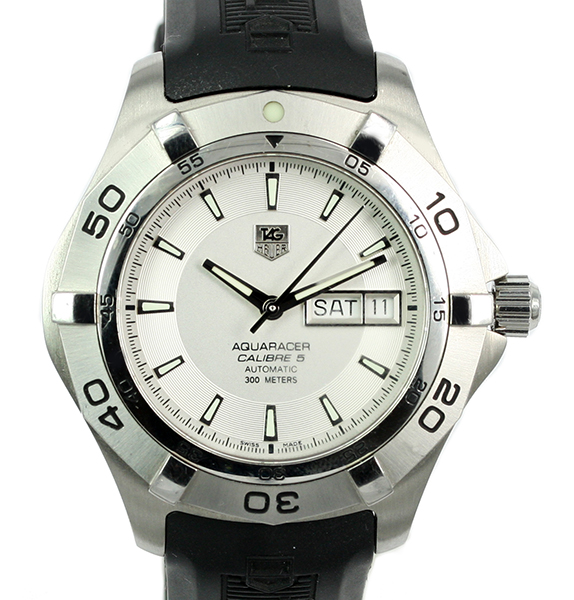 ![]() | Tag Heuer Aquaracer Automatic Cal 5 Model: WAF2011.FT8010 Watch Description: Stainless steel case, silver dial with day and date. Tag Heuer black rubber strap with steel Tang buckle. Age: 2010 Movement: Automatic Movement Calibre: 5 Case Size: 41mm Includes: Box Condition: 9/10 Price: NZ$1,650.00 Images Of This Tag Heuer Watch » |