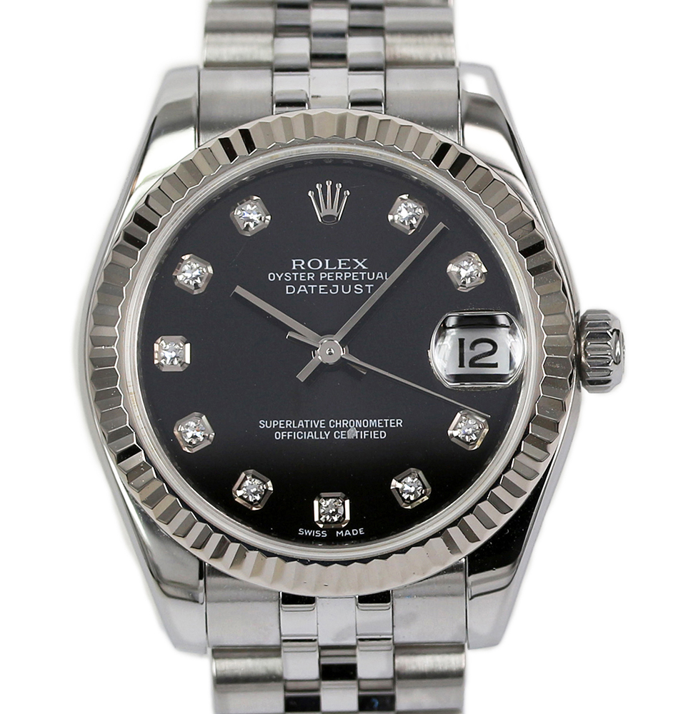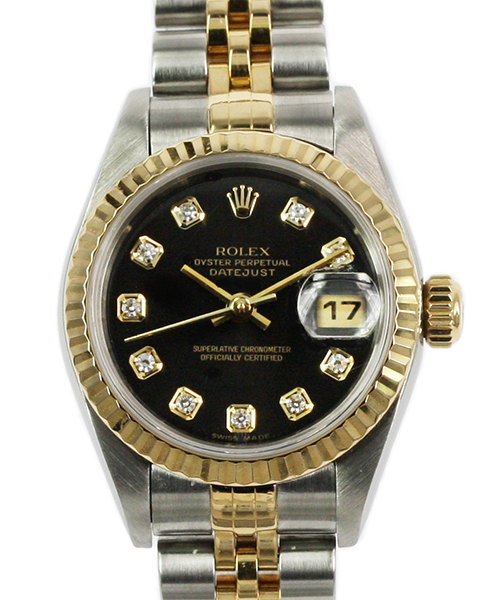 ![]() | Rolex Ladies Datejust Model: 79173 Watch Description: Stainless steel case with 18ct yellow gold fluted bezel. Black dial with 10x diamonds marking the hours, date at the 3 o'clock position. Steel and 18ct yellow gold Jubilee bracelet with steel folding clasp. Age: 2000 Movement: Automatic Case Size: 26mm Includes: Box Condition: 9/10 Price: NZ$5,500.00 Images Of This Rolex Watch » |