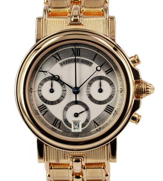 ![]() | Breguet Marine Chronograph Model: 3460BA/12/996 Watch Description: 18ct yellow gold case and Dark Brown Alligator Strap with Gold Deployant Clasp Age: 2000 Movement: Automatic Case Size: 35.5mm Includes: Box Condition: 9/10 Price: SOLD Images Of This Breguet Watch » |