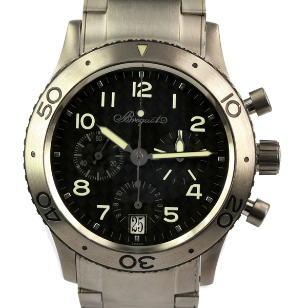 ![]() | Breguet Type XX Transatlantique Model: 3820TI K2 TW9 Watch Description: Titanium Case and Bracelet, Carbon Fibre Dial, Chronograph Movement Age: 2008 Movement: Automatic Case Size: 40mm Includes: Box & Papers Condition: 9.5/10 Price: SOLD Images Of This Breguet Watch » |