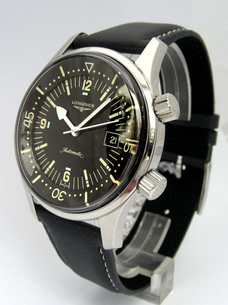 | Longines Legend DiverModel: L36744502 Watch Description: Stainless Steel with Cal. ETA 2824-2 with kevlar strap Age: 2009 Movement: Automatic Case Size: 42mm Includes: Box & Papers Condition: 10/10 New Retail Price: NZ$3,500.00 Price: SOLD