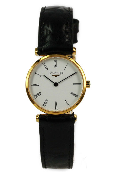 | Longines Ladies La Grande ClassiquesModel: L4.209.2.11.2 Watch Description: Gold PVD Case, white Roman Dial, Black Leather Strap Age: 2008 Movement: Quartz Case Size: 23mm Includes: Box & Papers Condition: 8.5/10 New Retail Price: NZ$1,850.00 Price: SOLD