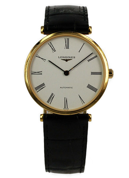 | Longines Gents La Grande ClassiquesModel: L4.708.2.11. Watch Description: Gold PVD Case, white Roman Dial, Black Leather Strap Age: 2004 Movement: Automatic Case Size: 35mm Includes: Nothing Condition: 8/10 New Retail Price: NZ$2,350.00 Price: SOLD