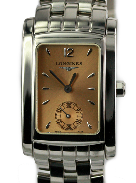 | Longines Dolce Vita Ladies Mid SizeModel: L5.502.4.96.6 Watch Description: Stainless Steel case and Bracelet Bronze Dial Age: 2012 Movement: Quartz Case Size: 34mm x 27mm Includes: Box Condition: 8.5/10 New Retail Price: NZ$2,150.00 Price: SOLD |