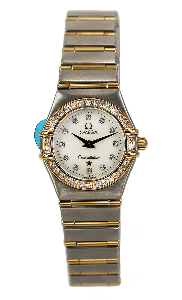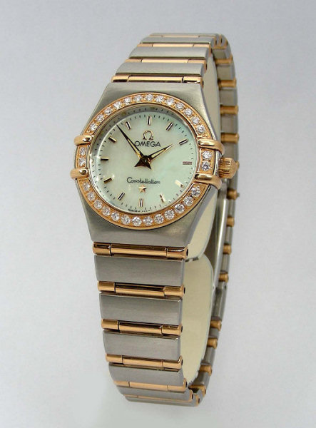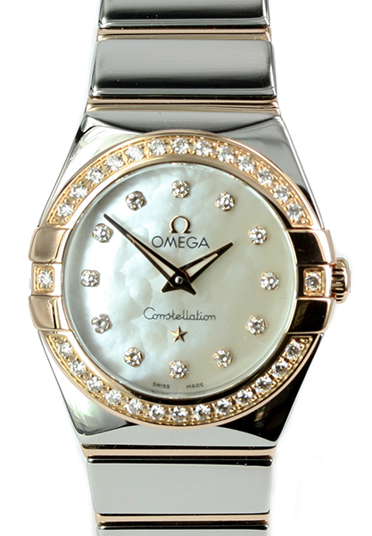 | Omega Ladies ConstellationModel: 12325246055005 Watch Description: Steel and 18ct red Gold case and bracelet. Mother of pearl and daimond set dial, diamond set bezel. Diamonds are: