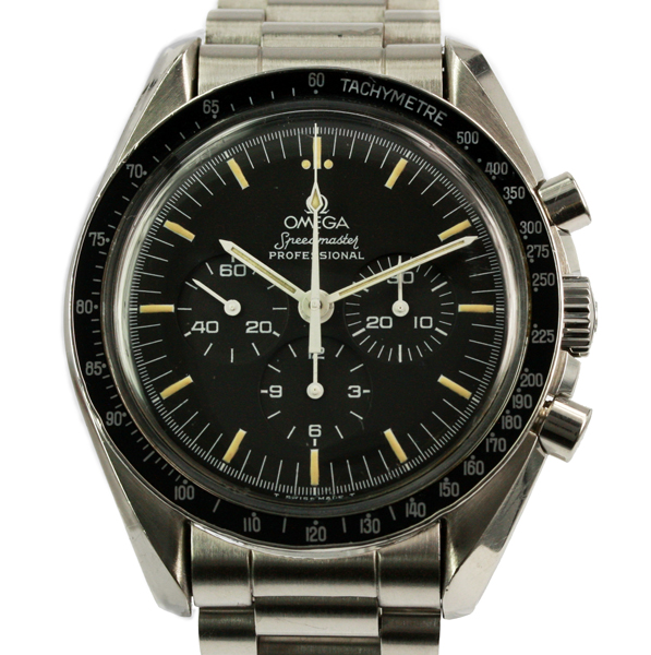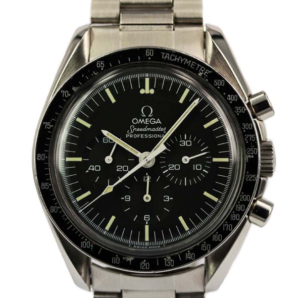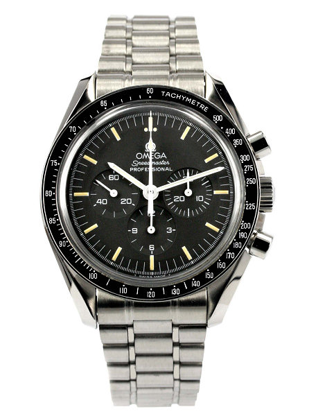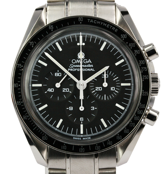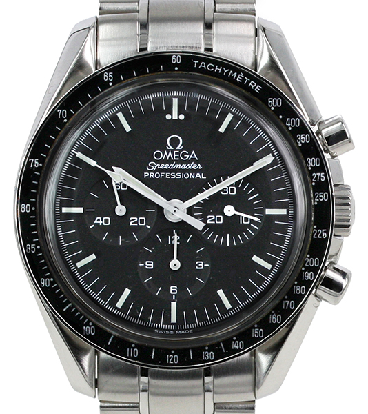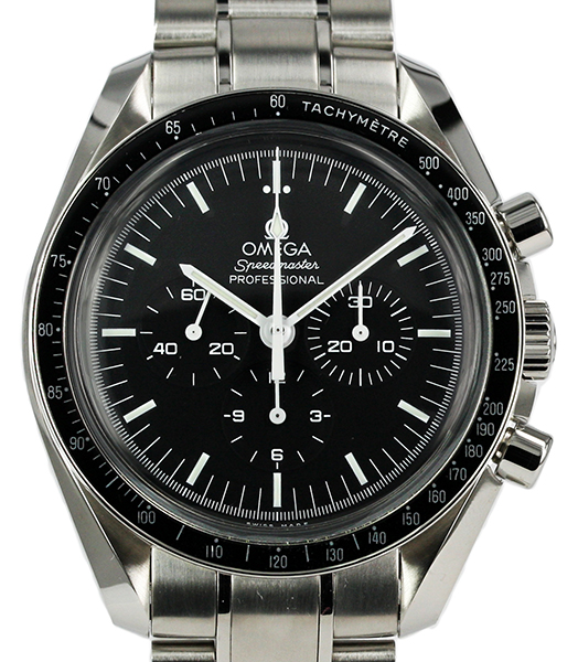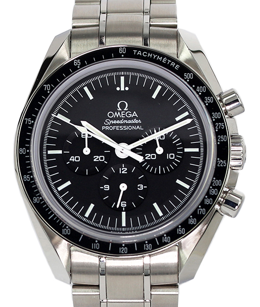 | Omega Speedmaster Professional Moon WatchModel: 031130423001005 Watch Description: Black dial with hesalite crystal, small seconds sub-dial, 30-minute recorder and 12-hour with centre chronograph hand. Black bezel, with tachymetric scale, stainless steel case and bracelet.