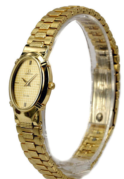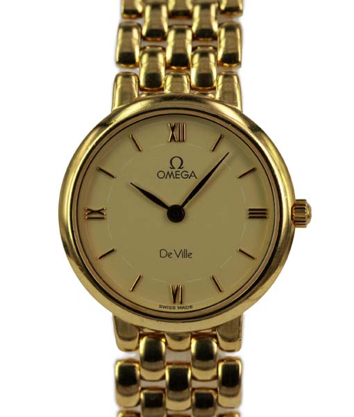 | Omega Ladies De VilleModel: 1450 Watch Description: 18ct yellow gold case and bracelet with folding clasp Age: 1976 Movement: Quartz Case Size: 18x30mm Includes: Papers Condition: 9.5/10 Price: SOLD