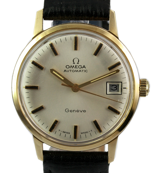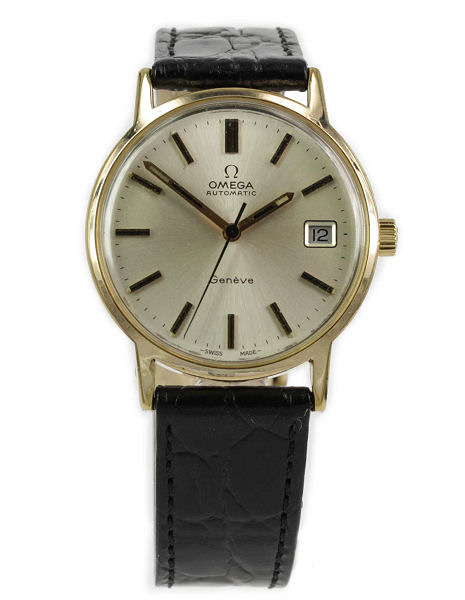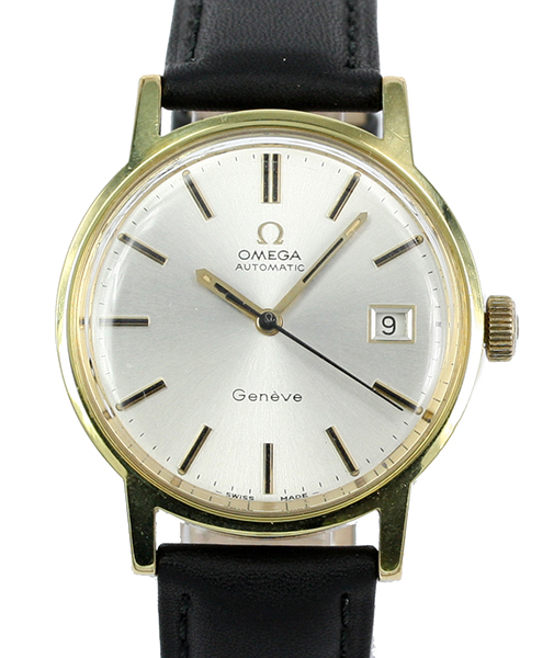 | Omega Vintage Automatic GenevaModel: 6011 Watch Description: 9ct Gold Case with Silver Dial and Gold Baton Hour Markers, Hour Minute, Centre Seconds Hands and Calendar. Watch fitted with Black Leather Strap and Omega G/F Tang Buckle. Movement calibre 565. 9ct Gold Caseback engraved with Presentation Name & Date. Age: 1970s Movement: Automatic Case Size: 35mm Includes: Box Condition: 9/10 Price: SOLD |