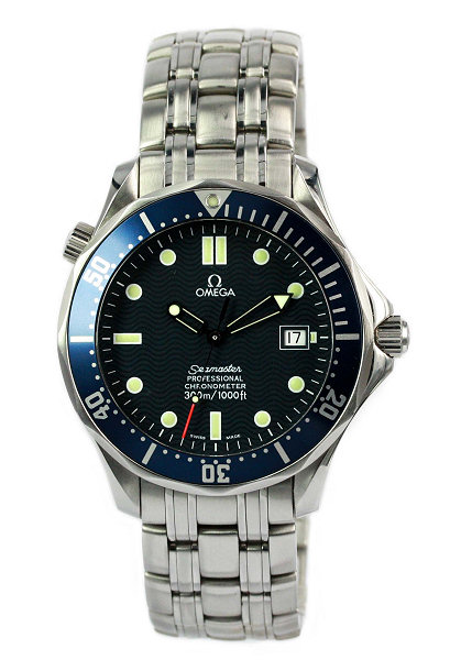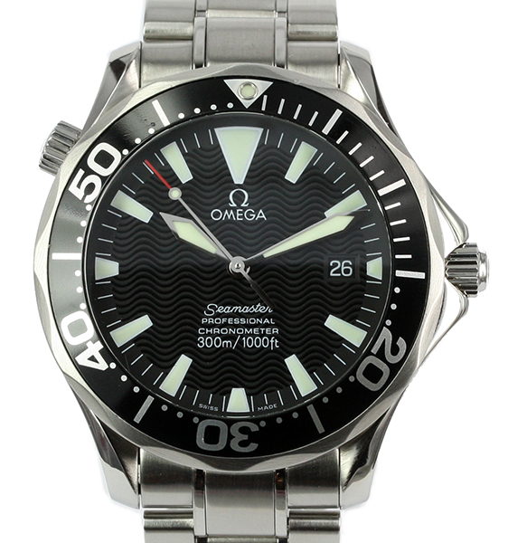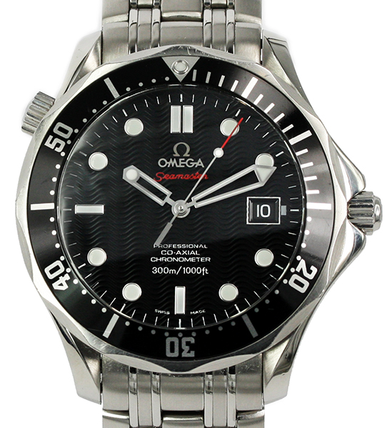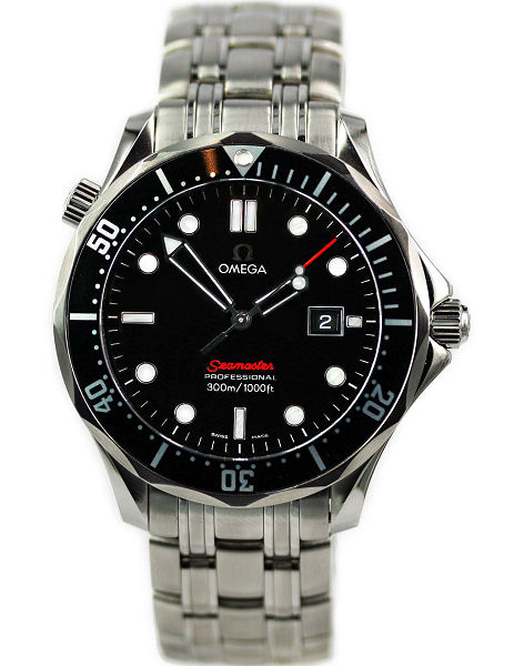 | Omega Seamaster Professional 300Model: 021230412001003 Watch Description: Steel case and bracelet, black dial with a date window at the 3 o’clock position. Scratch-resistant sapphire crystal glass. Black ceramic unidirectional rotating bezel, helium-escape valve at 10 o'clock.