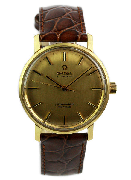| Omega Vintage Seamaster De VilleModel: 165/6-5020 Watch Description: 18ct yellow gold English Hallmarked Case with Champagne Dial and Omega Crown, cal 552. Fitted with brown leather Hirsch strap Age: 1960s Movement: Automatic Case Size: 35mm Includes: Box Condition: 8/10 Price: SOLD |