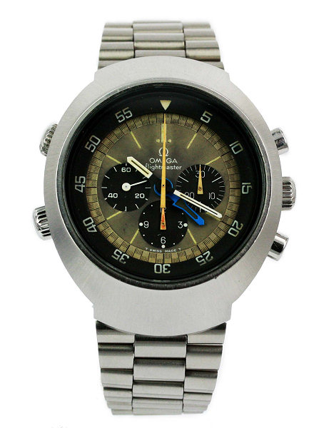 | Omega Vintage FlightmasterModel: 911 GMT Watch Description: Steel case and bracelet chronograph with GMT function, Lemania calibre 911, steel Omega bracelet Age: 1960s Movement: Manual Case Size: 42.6mm Includes: Box Condition: 7/10 Price: SOLD