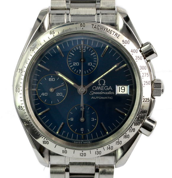 | Omega Speedmaster DateModel: 3511-80 Watch Description: Steel Case and Bracelet, Blue Dial, Automatic Chronograph Age: 1997 Movement: Automatic Case Size: 40mm Includes: Box Condition: 8/10 Price: SOLD |