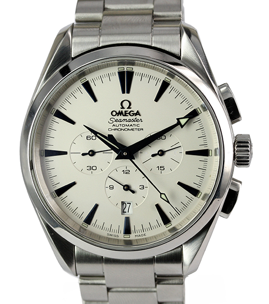 | Omega Seamaster Aqua Terra ChronographModel: 2512.30.00 Watch Description: Stainless steel case with steel fixed bezel and steel bracelet. White dial with blue hands and index markers , automatic chronometer movement. Water Resistant 150 metres.