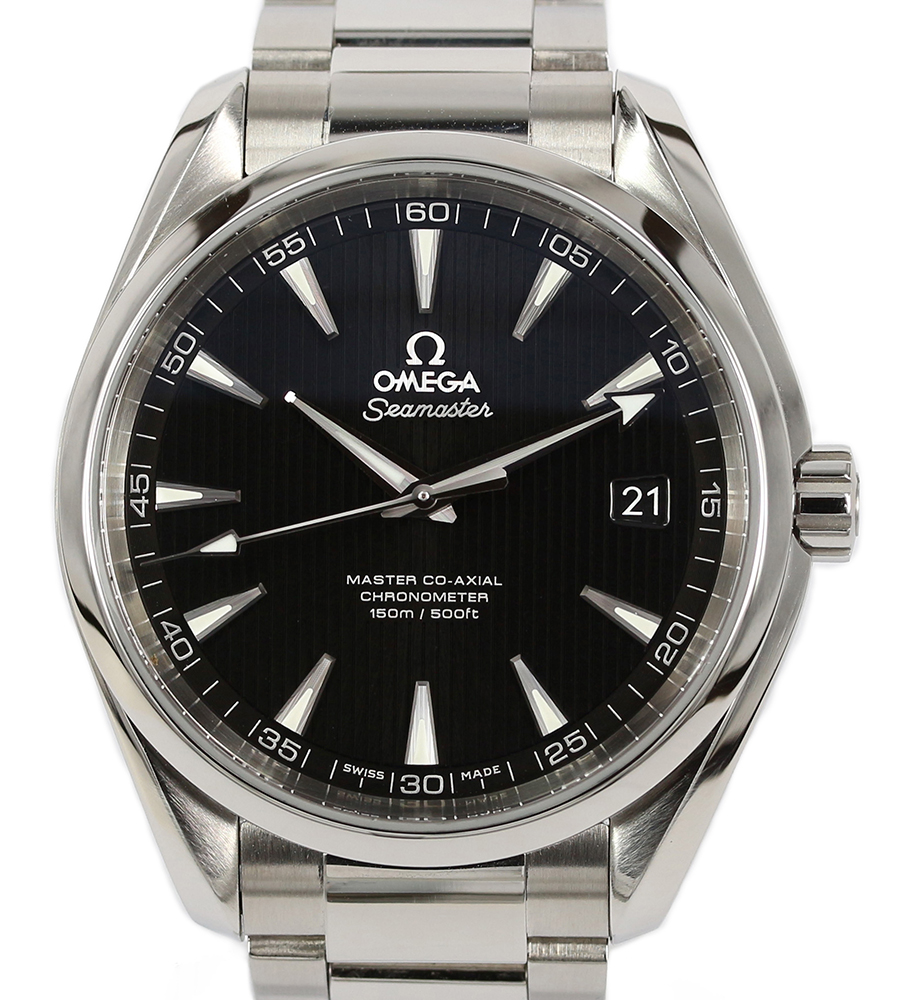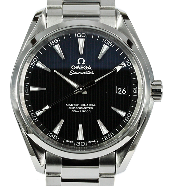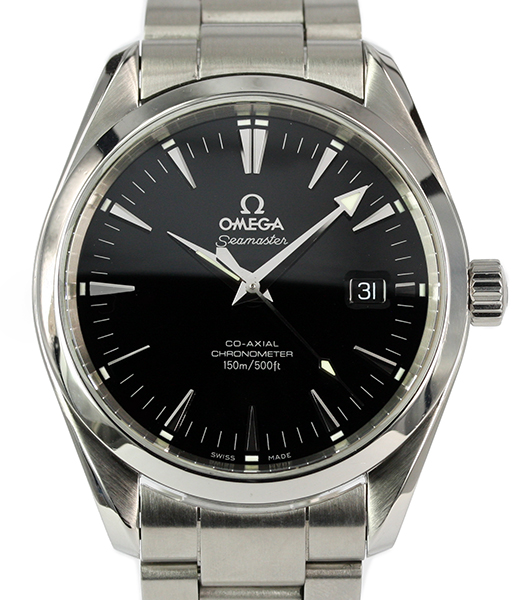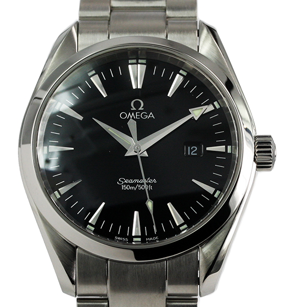| Omega Aqua Terra QuartzModel: 25185000 Watch Description: Steel case with black dial, 150m water resistant. Steel bracelet with folding clasp.