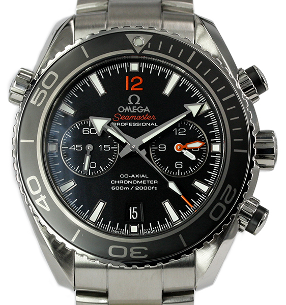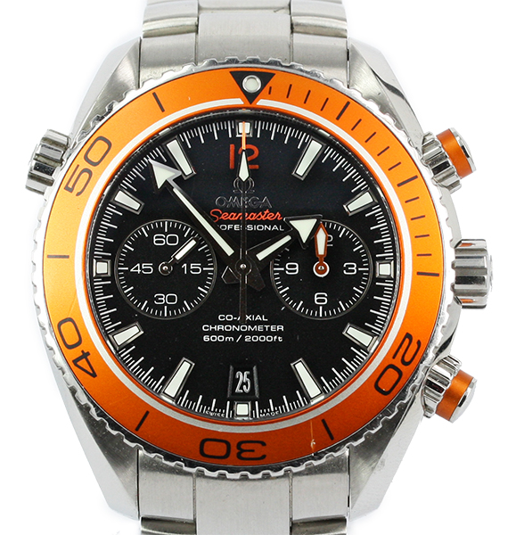 | Omega Seamaster Planet Ocean 600m ChronographModel: 23230465101002 Watch Description: Stainless steel case, uni-directional rotating bezel with orange aluminum top. Black dial with luminous hour markers, date at 6 o'clock. Chronograph sub-dials displaying: 60 minutes and 12 hours. Skeleton case. Steel bracelet with folding clasp. Age: 2000s Movement: Automatic Movement Calibre: 9300 Case Size: 45mm Includes: Box Condition: 9/10 New Retail Price: NZ$10,950.00 Price: SOLD |
