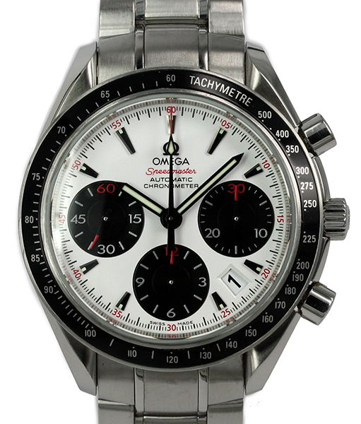 | Omega Speedmaster DateModel: 03233040400400 Watch Description: Steel case with sapphire crystal, white dial with calendar, small seconds sub-dial, 30-minute recorder and 12-hour recorder. Each of the black sub-dials has a textured “Clous de Paris” pattern. Watch fitted with Omega steel bracelet and deployment clasp. Age: 2010 Movement: Automatic Movement Calibre: 3304 Case Size: 40mm Includes: Box & Papers Condition: 9/10 Price: SOLD |