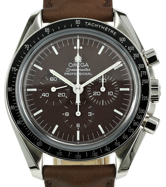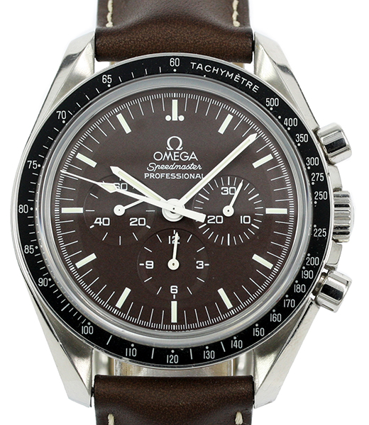 | Omega Speedmaster Professional Moon WatchModel: 31132423013001 Watch Description: Stainless Steel case with fixed tachymeter bezel, brown dial, manual wind (Cal. 1863), 12-hour chronograph, sapphire crystal display back. Watch fitted with Omega brown leather strap and steel deployant clasp. Age: 2011 Movement: Manual Movement Calibre: 1863 Case Size: 42mm Includes: Box & Papers Condition: 9/10 New Retail Price: NZ$8,995.00 Price: SOLD |
