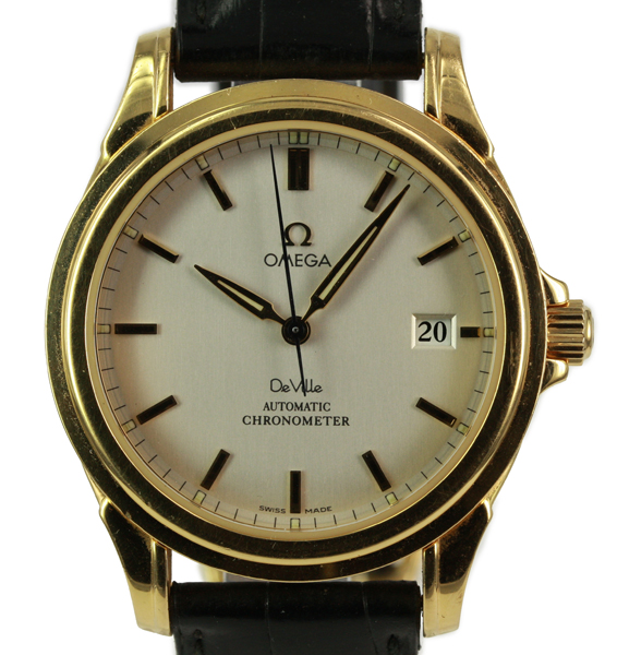 | Omega De Ville Co-AxialModel: 4631.30.31 Watch Description: 18ct Yellow Gold Case, Silver/White Dial with Black Alligator Strap and 18ct Gold Deployant Clasp Age: 2001 Movement: Automatic Case Size: 38mm Includes: Box & Papers Condition: 9/10 Price: SOLD |