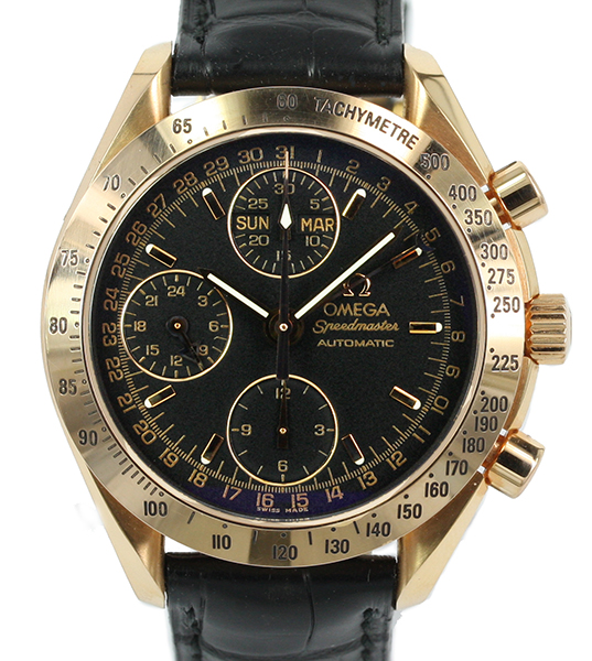 | Omega Speedmaster Day DateModel: 3623.50.01 Watch Description: 18ct rose gold case, fixed bezel with tachymeter markings, black dial and Triple Calendar Chronograph, domed sapphire crystal glass.