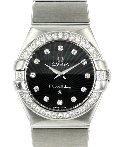 | Omega Ladies ConstellationModel: 123.15.27.60.51.002 Watch Description: Steel case with black dial and supernova pattern, diamond-set indexes and scratch-resistant sapphire crystal. Bezel set with 32x diamonds. The satin finished stainless steel bracelet has double folding concealed clasp. Age: 2014 Movement: Quartz Movement Calibre: 1376 Case Size: 27mm Includes: Box & Papers Condition: 9/10 New Retail Price: NZ$8,900.00 Price: SOLD |