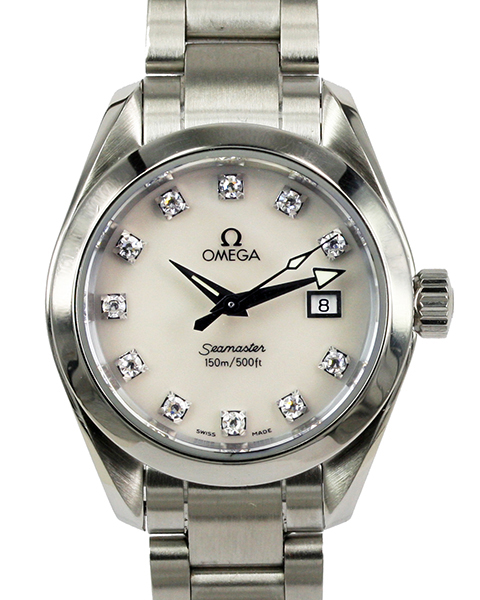 | Omega Aqua Terra 30mm LadiesModel: 2577.75.00 Watch Description: Stainless steel case with steel bracelet. White Mother of Pearl dial set with 11 diamond hour markers, Date displayed at three o'clock. 150m water resistant. Age: 2005 Movement: Quartz Case Size: 30mm Includes: Box & Papers Condition: 9/10 Price: SOLD |