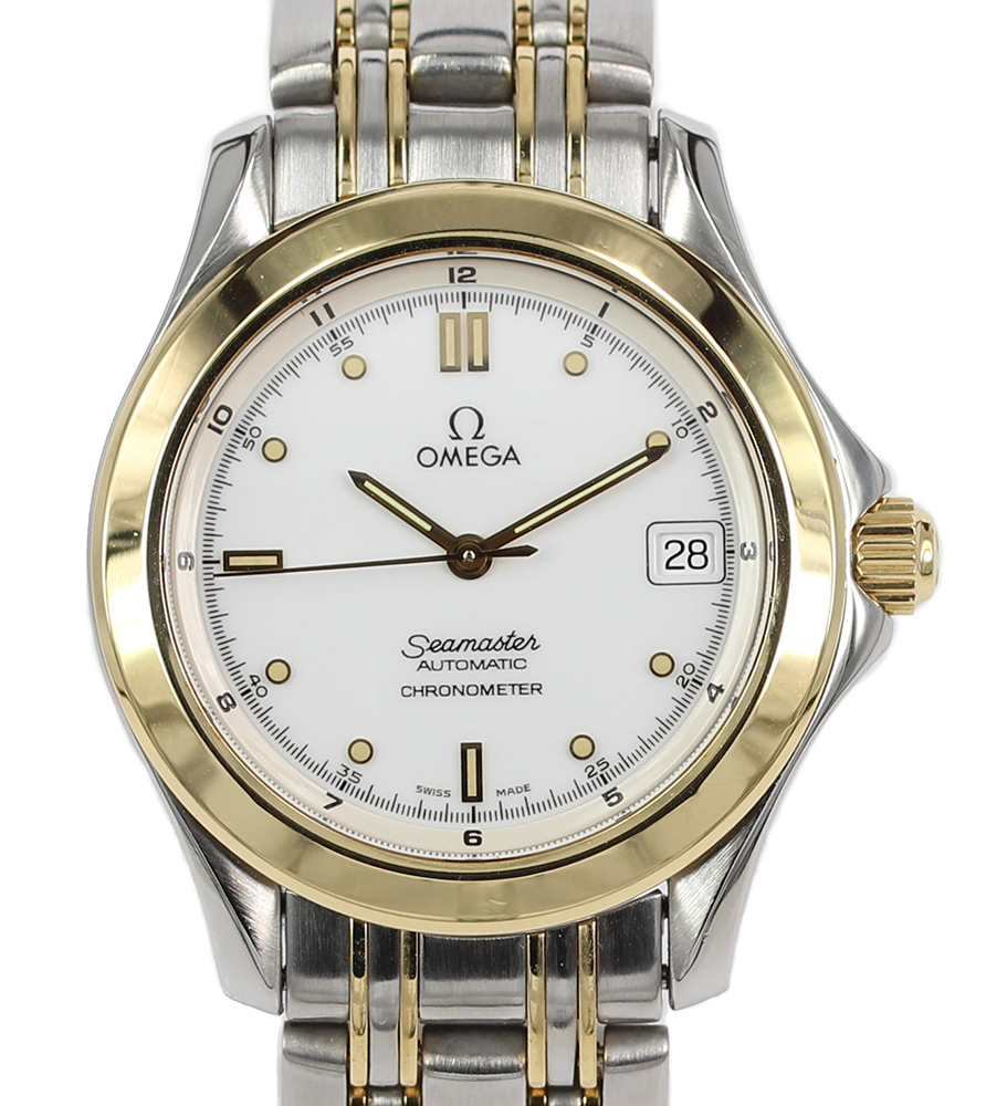 | Omega Seamaster 120mModel: 2301.20.00 Watch Description: Stainless steel and 18ct yellow gold case and bracelet. White dial automatic chronometer watch with hour minute centre seconds and date. Age: 1990s Movement: Automatic Case Size: 37mm Includes: Box & Papers Condition: 9/10 Price: SOLD |