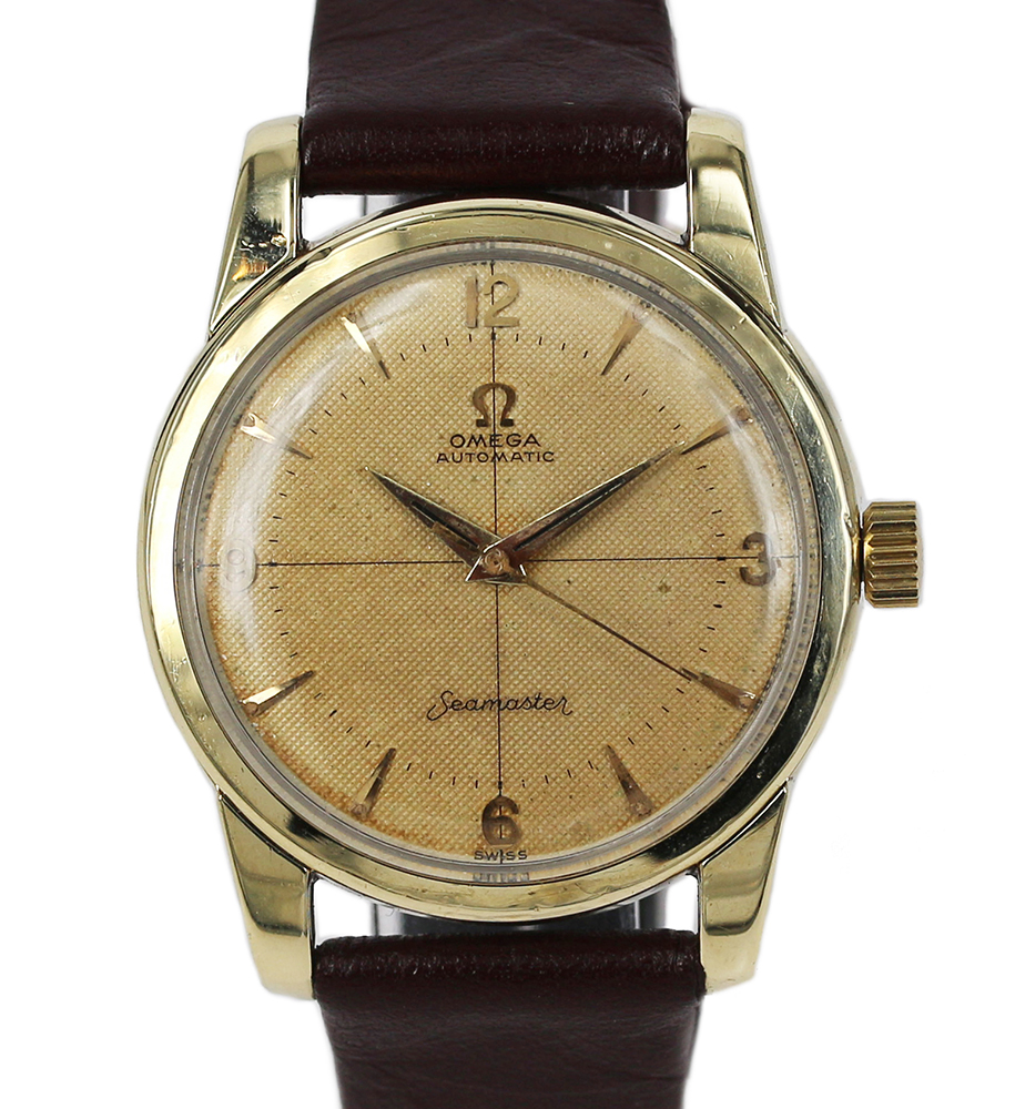 | Omega Vintage SeamasterModel: 2846-2848 Watch Description: Gold shell case with wide bezel and stainless steel case back. Original, aged, textured champagne dial with applied gold indexes, applied Omega logo, and gilt dauphine hands. Fitted with leather strap Age: 1958 Movement: Automatic Movement Calibre: 501 Case Size: 36mm Includes: Nothing Condition: 6/10 Price: SOLD |