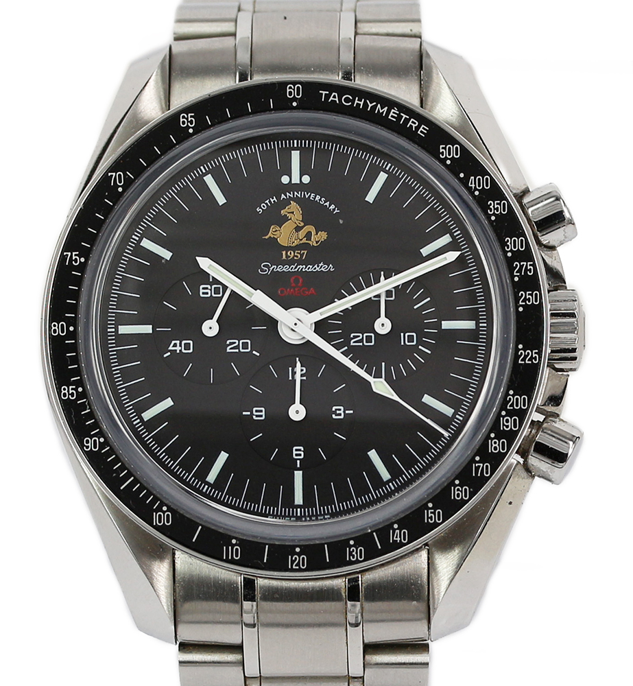 | Omega Speedmaster Moon Anniversary EditionModel: 311.30.42.30.01.001 Watch Description: Stainless case with case back engraved with the number of the Limited Series 4357./5957. First introduced in 2007 to commemorate the 50th anniversary of the Speedmaster watch. The dial features a special Seahorse '1957' logo. Age: 2011 Movement: Manual Movement Calibre: 1861 Case Size: 42mm Includes: Box & Papers Condition: 9/10 Price: SOLD |